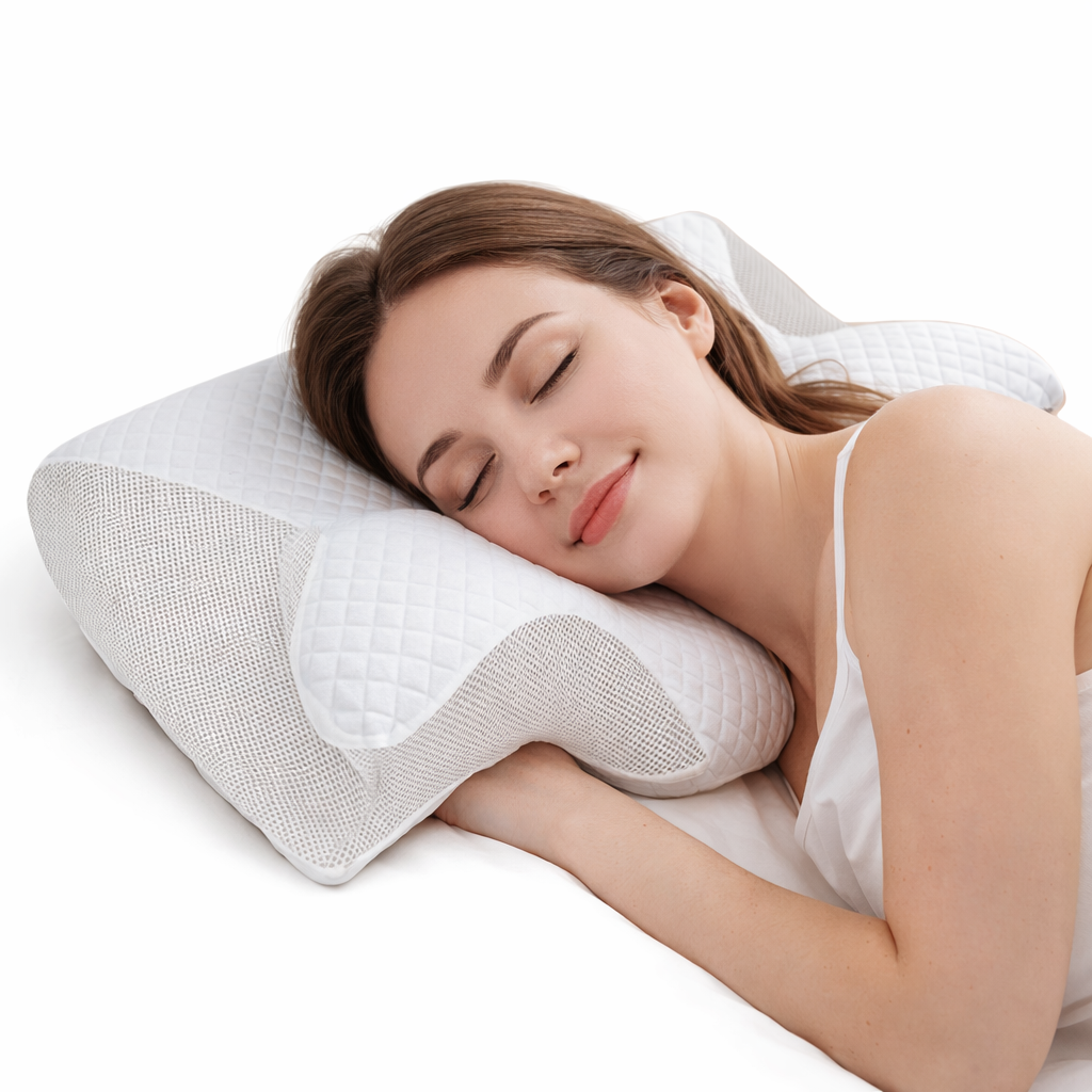 The butterfly-shaped design is specifically engineered to follow the natural curve of the cervical spine. It provides balanced support for the head, neck, and shoulders, helping maintain proper spinal alignment during sleep.